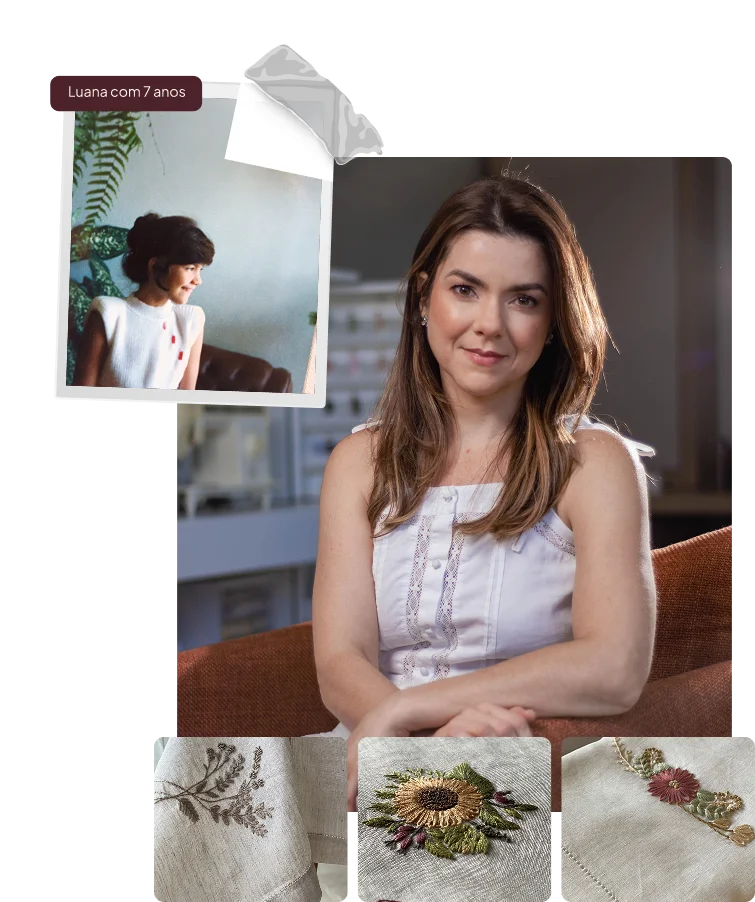 Minha história com o bordado começou aos 7 anos, no armarinho da minha mãe, um lugar onde fios, agulhas e botões se misturavam a histórias e afeto. Aprendi com as mulheres da minha família, que bordar é mais que uma técnica: é tradição, memória e expressão. Mesmo formada e atuando como farmacêutica industrial, foi na maternidade que redescobri o bordado como terapia e fonte de renda.